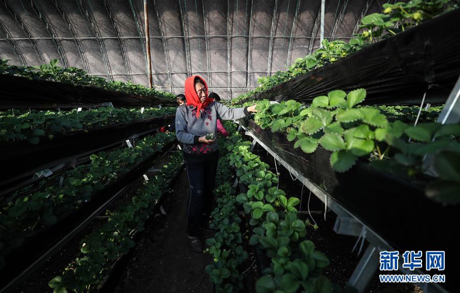 12月19日,農(nóng)戶(hù)在大棚里管理草莓。 2017年5月,遼寧省鐵嶺市昌圖縣大四家子鎮(zhèn)方家船口村利用土地確權(quán)成果,由村兩委班子成員領(lǐng)辦創(chuàng)辦了昌圖久晟果木蔬菜種植專(zhuān)業(yè)合作社。到2018年9月,合作社利用產(chǎn)業(yè)扶貧資金、壯大村集體經(jīng)濟(jì)扶持資金、村集體用地和村民入股資金建成了11個(gè)“股份制大棚”,主要種植草莓等作物,產(chǎn)品通過(guò)電商銷(xiāo)往云南、四川、北京、上海等地,預(yù)計(jì)第一期可為265名貧困戶(hù)每人分紅860元。 新華社記者潘昱龍攝