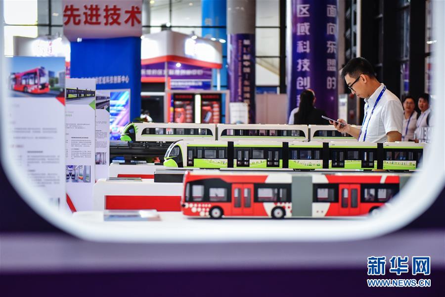 在廣西南寧國(guó)際會(huì)展中心展出的中車(chē)集團(tuán)的新型公共交通車(chē)輛模型(9月13日攝)。