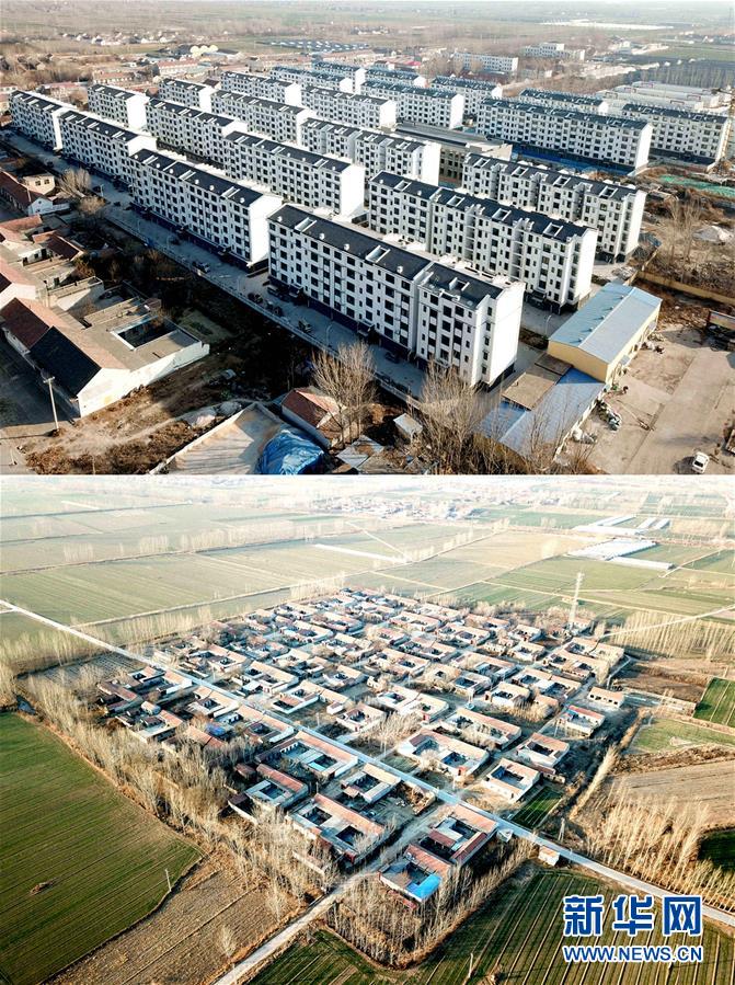 上圖為12月20日拍攝的青城鎮(zhèn)青平社區(qū);下圖為12月20日拍攝的搬遷完畢的青城鎮(zhèn)菜園村(無人機(jī)航拍,拼版照片)。