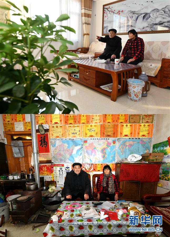 上圖為12月20日拍攝的青城鎮(zhèn)菜園村村民韓貽崗(左)和愛(ài)人在青平社區(qū)新居客廳內(nèi);下圖為12月20日拍攝的韓貽崗(左)和愛(ài)人在舊居客廳內(nèi)(拼版照片)。 新華社記者 朱崢攝