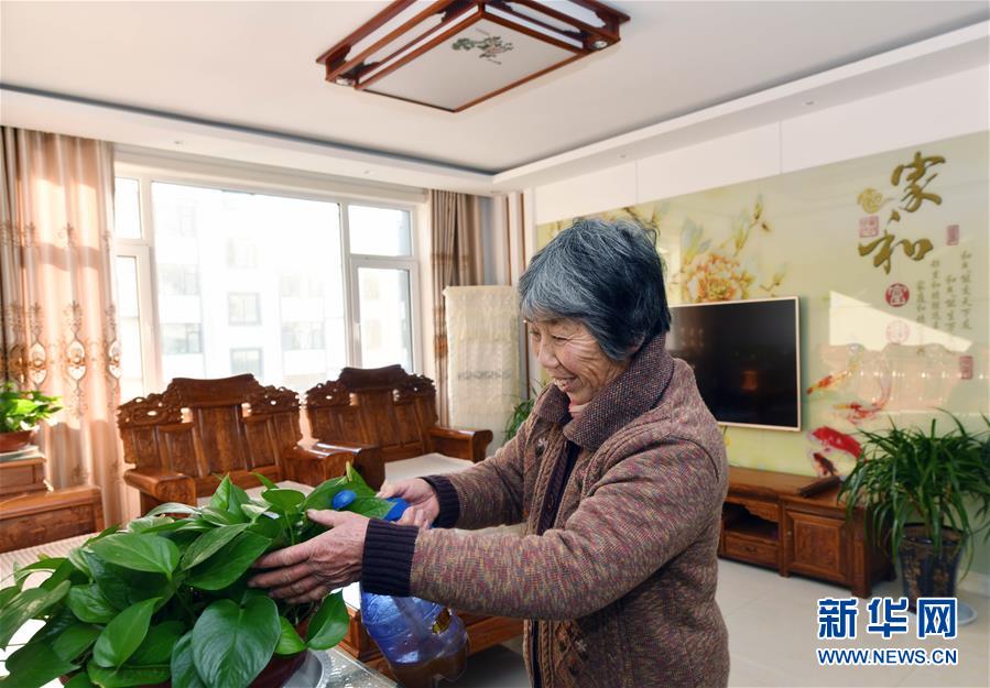 12月20日,青城鎮(zhèn)游家村村民薛繼榮在青平社區(qū)新居內(nèi)澆花。 新華社記者 朱崢攝
