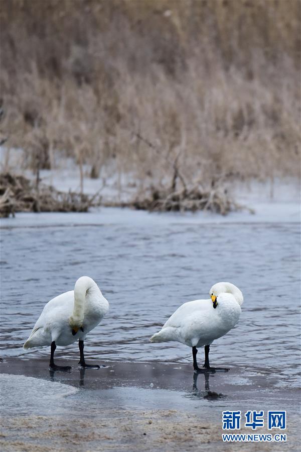 12月21日,兩只天鵝在黃河岸邊嬉戲。新華社記者吳剛攝