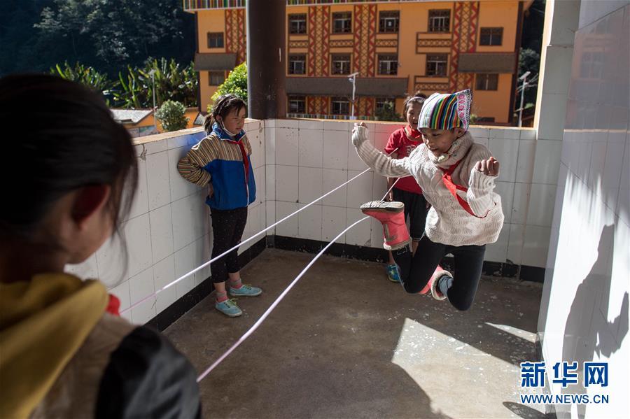 在獨龍江鄉(xiāng)中心小學,孩子們在跳皮筋(2016年11月23日攝)。 新華社記者 胡超 攝