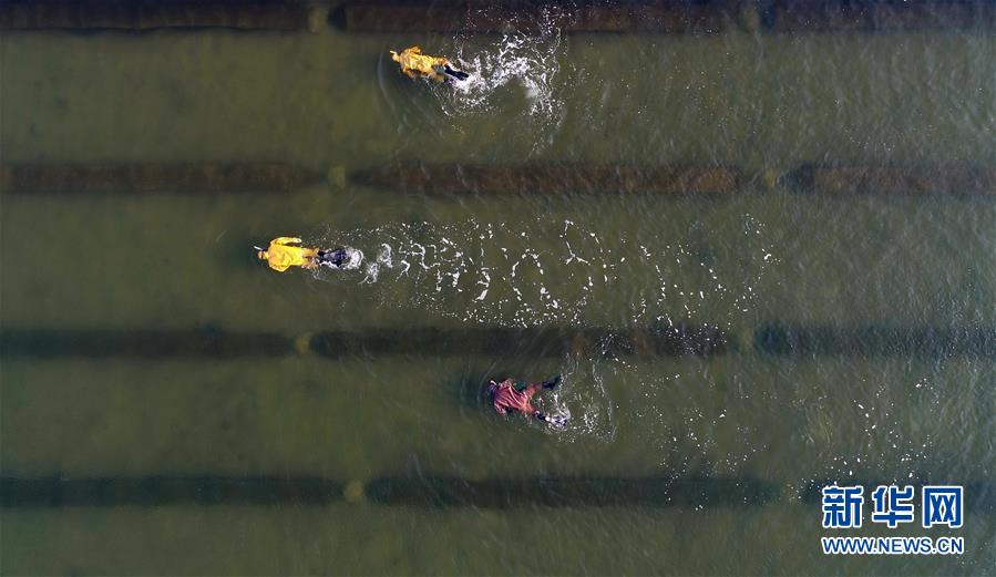 10月22日,樂(lè)亭縣姜各莊鎮(zhèn)二節(jié)村海參養(yǎng)殖基地的工人在捕撈海參(無(wú)人機(jī)拍攝)。 時(shí)下,正值渤海灣地區(qū)海參收獲時(shí)節(jié),河北省樂(lè)亭縣的海參養(yǎng)殖戶忙著捕撈海參,供應(yīng)各地市場(chǎng)。據(jù)介紹,該縣海域水質(zhì)優(yōu)良、氣候適宜,是海參養(yǎng)殖的理想場(chǎng)地,目前發(fā)展池塘造礁養(yǎng)殖海參面積6萬(wàn)畝,年產(chǎn)鮮活海參6000多噸,年產(chǎn)值2億多元。  新華社記者 楊世堯 攝