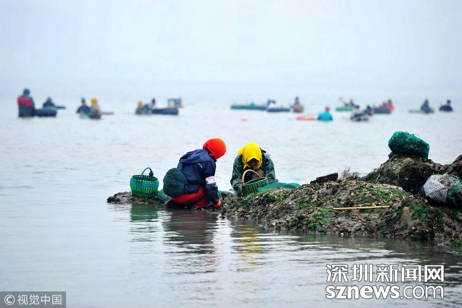 深圳新聞網(wǎng)2018年12月25日訊  二十四節(jié)氣冬至適逢天文大潮,西海岸新區(qū)唐島灣南岸,來(lái)自附近十余公里甚至青島市區(qū)的市民來(lái)到退潮后的灣底,在齊腰深的海水中挖拾牡蠣(海蠣子)或在沙灘上挖拾蛤蜊。經(jīng)過(guò)近2個(gè)多小時(shí)的辛勤勞作,市民們收獲滿滿返回。