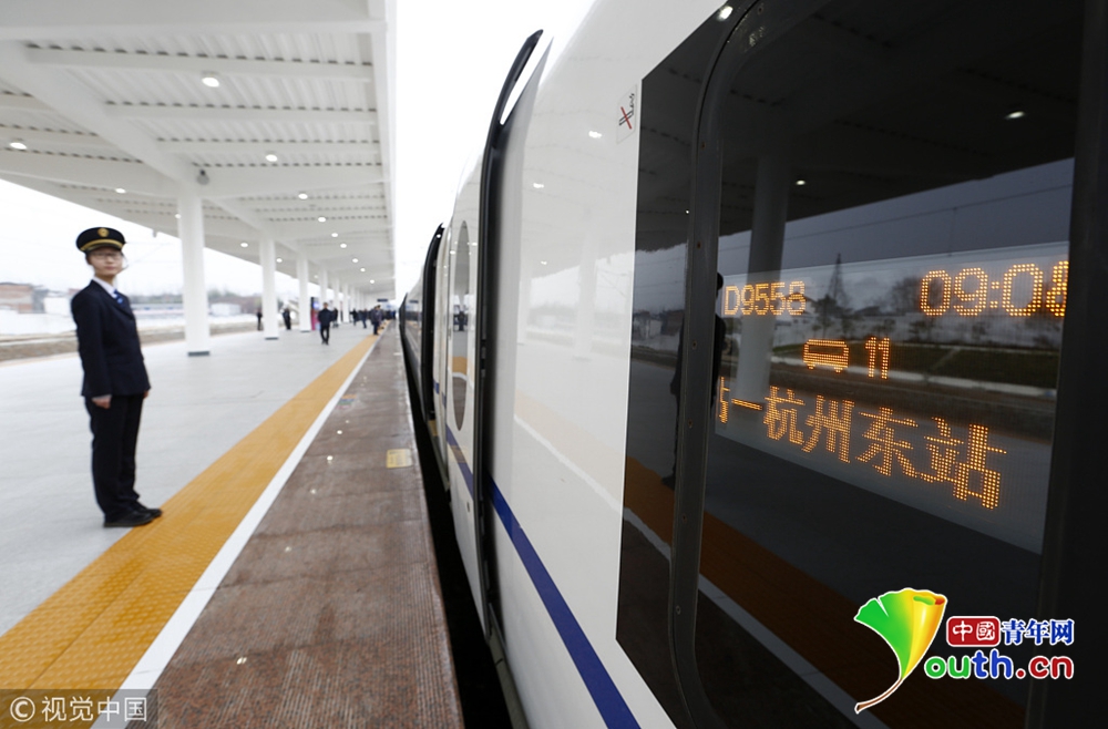 12月25日,杭黃高鐵D9551次首發(fā)列車即將從杭州東站駛出。