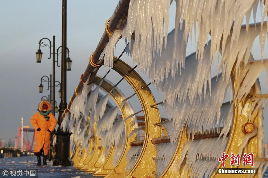 渤海海水在北風(fēng)的作用下涌向岸邊,在大連東港海岸護(hù)欄上凝結(jié)成冰凌,形成約有兩公里的冰凌奇觀。圖為大連市東港海岸護(hù)欄結(jié)滿晶瑩剔透的冰棱。圖片來源:視覺中國