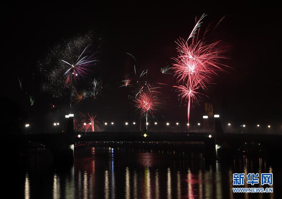 2018年12月31日,德國法蘭克福美因河畔煙花綻放。 新華社記者逯陽攝