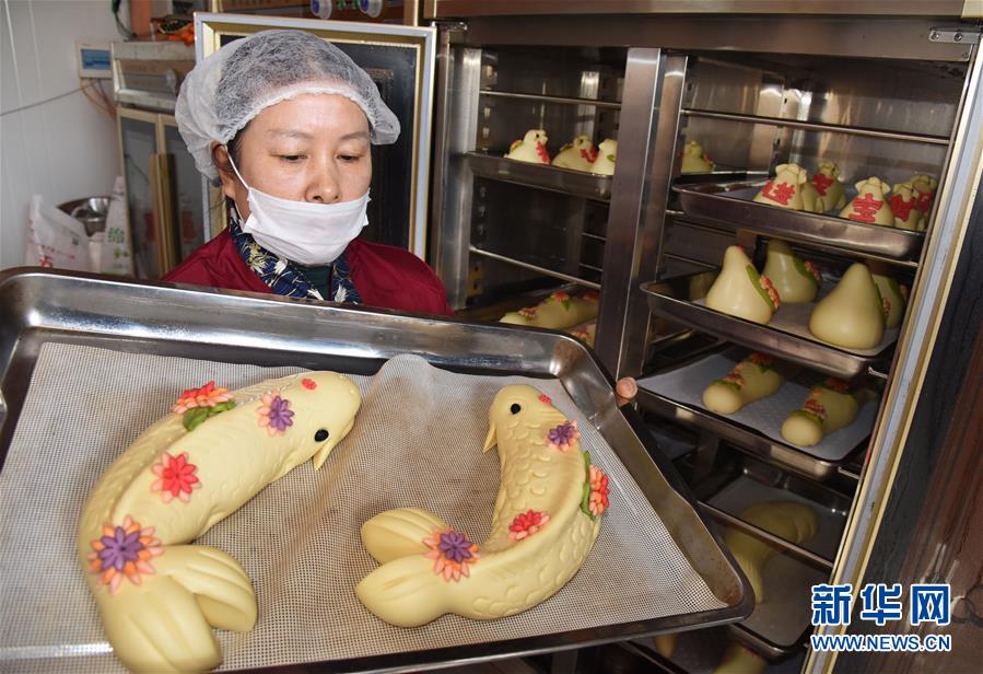 1月8日,工作人員展示剛出籠的“連年有魚”花餑餑。 新華社記者 李紫恒 攝