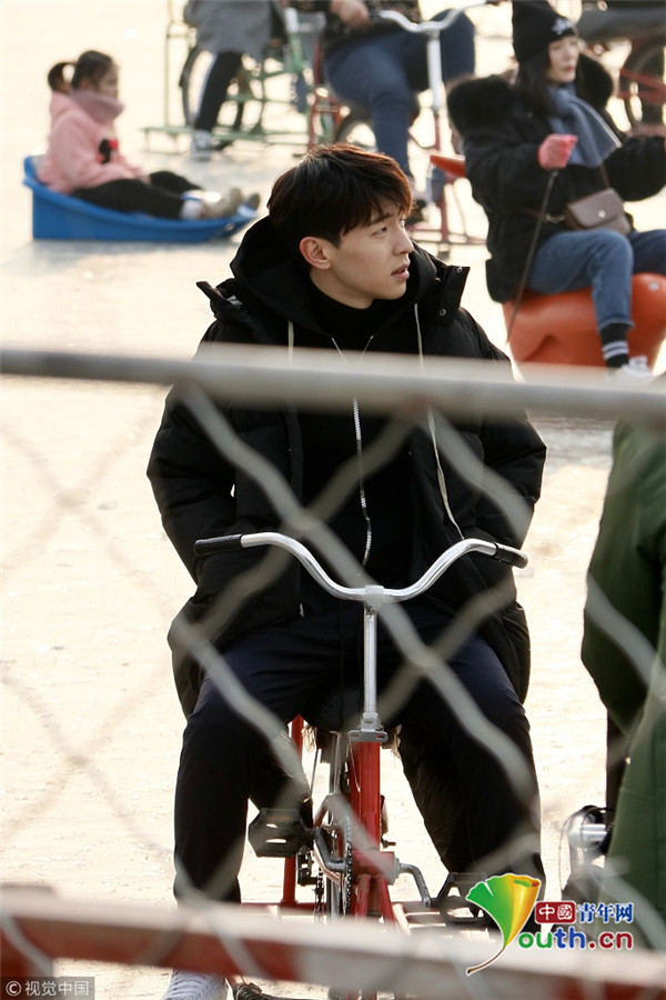 2019年1月9日,北京,鄧倫、馬思純現(xiàn)身后?;鶊?,騎冰車拍攝新劇《加油你是最棒的》。寒冷的北京,二人身著單薄的劇中服裝現(xiàn)身拍攝片場,不顧嚴(yán)寒超敬業(yè)。