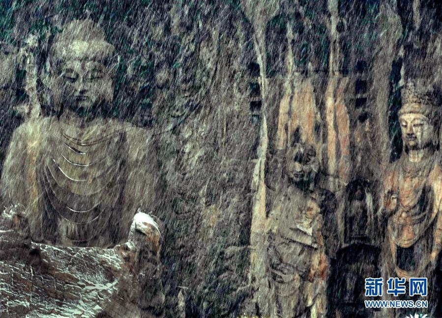洛陽(yáng)龍門石窟景區(qū)內(nèi)的盧舍那大佛在雪中若隱若現(xiàn)(1月9日攝)。 新華社記者李安攝