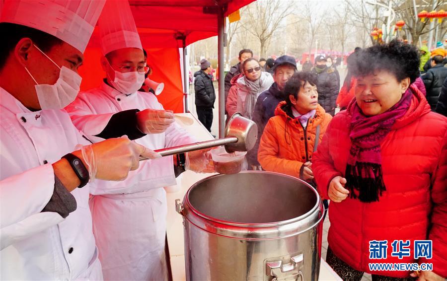 1月12日,人們?cè)谀曦洿蠹吓抨?duì)品嘗臘八粥。