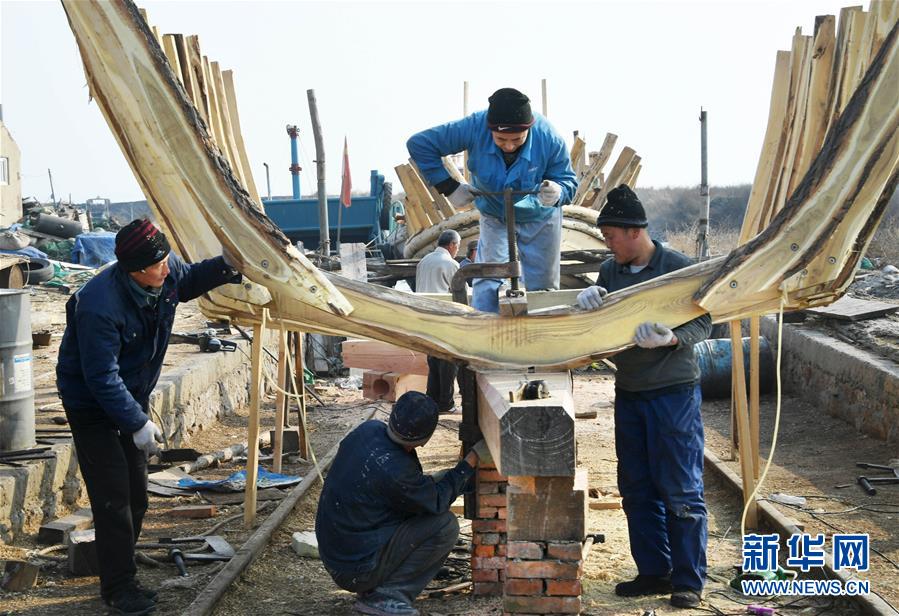 在青島紅雙木造船廠,幾位造船師傅在安裝船肋骨(1月10日攝)。