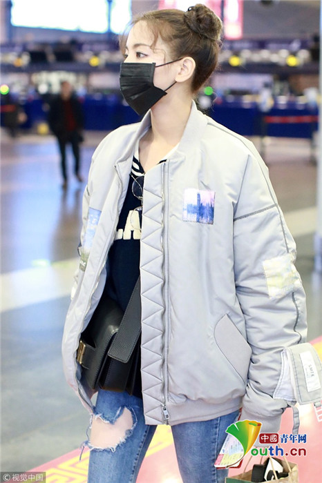 2019年1月14日,北京,楊超越現身機場。她扎哪吒頭活力十足,甩玩偶淘氣回眸,穿破洞褲露美腿,披面包服似自帶鼓風機。