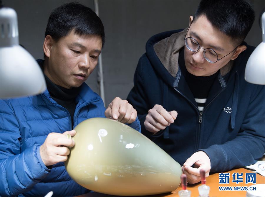 1月15日,龍泉青瓷藝術(shù)家楊盛侃(右)將一件有瑕疵的作品帶到吳榮強(qiáng)的工作室,跟他討論漆繕修復(fù)的細(xì)節(jié)。 新華社記者翁忻旸攝