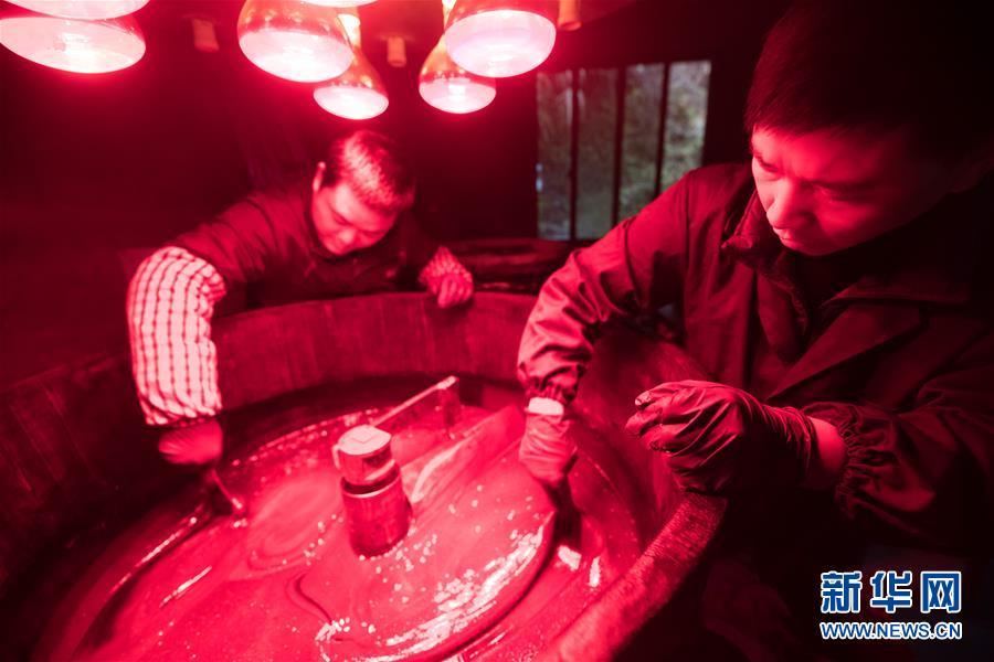 1月15日,吳榮強(右)和徒弟在龍泉市牛頭嶺村“七分醉”工作室曬漆。 新華社記者翁忻旸攝