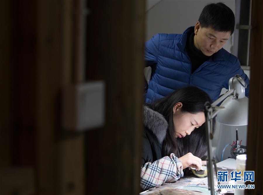 1月15日,吳榮強(qiáng)和妻子李淑敏在龍泉市牛頭嶺村“七分醉”工作室對一件漆繕器皿進(jìn)行打磨。吳榮強(qiáng)將工作室搬回龍泉后,原本從事設(shè)計(jì)行業(yè)的妻子也辭職加入工作室的日常工作。 新華社記者翁忻旸攝