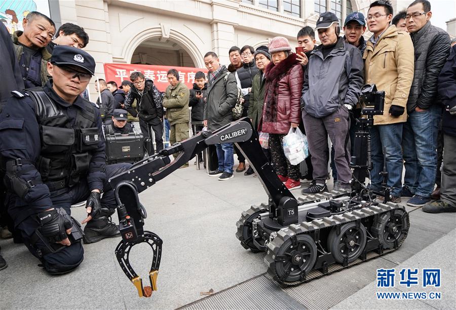 1月16日,旅客們在觀看警用排爆機(jī)器人演示。 當(dāng)日,武漢鐵路公安處在漢口火車站舉行警營開放日活動,讓旅客零距離接觸警務(wù)安全工作,營造良好的春運(yùn)出行環(huán)境。 新華社記者程敏攝
