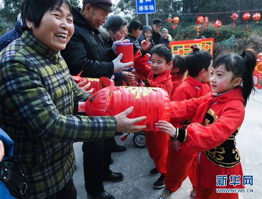 1月16日,孩子們把用廢舊物品制作的節(jié)日花燈送給村民。 臨近春節(jié),浙江省長(zhǎng)興縣開(kāi)發(fā)區(qū)中心幼兒園的老師和孩子們來(lái)到長(zhǎng)興縣太湖街道下屬的新塘村,為村民表演文藝節(jié)目,用喜慶的傳統(tǒng)舞蹈營(yíng)造節(jié)日氣氛。另外孩子們還用紙盒、瓶子、彩色包裝紙等廢舊物品制作了環(huán)?;?,送給村民,倡導(dǎo)低碳環(huán)保的節(jié)日新風(fēng)。 新華社記者 徐昱 攝