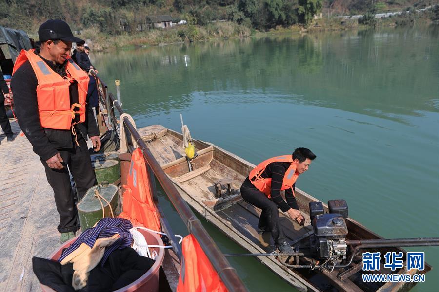 1月22日,賴福昌(右)在發(fā)動小船上的發(fā)動機,小船是大船的動力來源。 新華社記者 歐東衢 攝