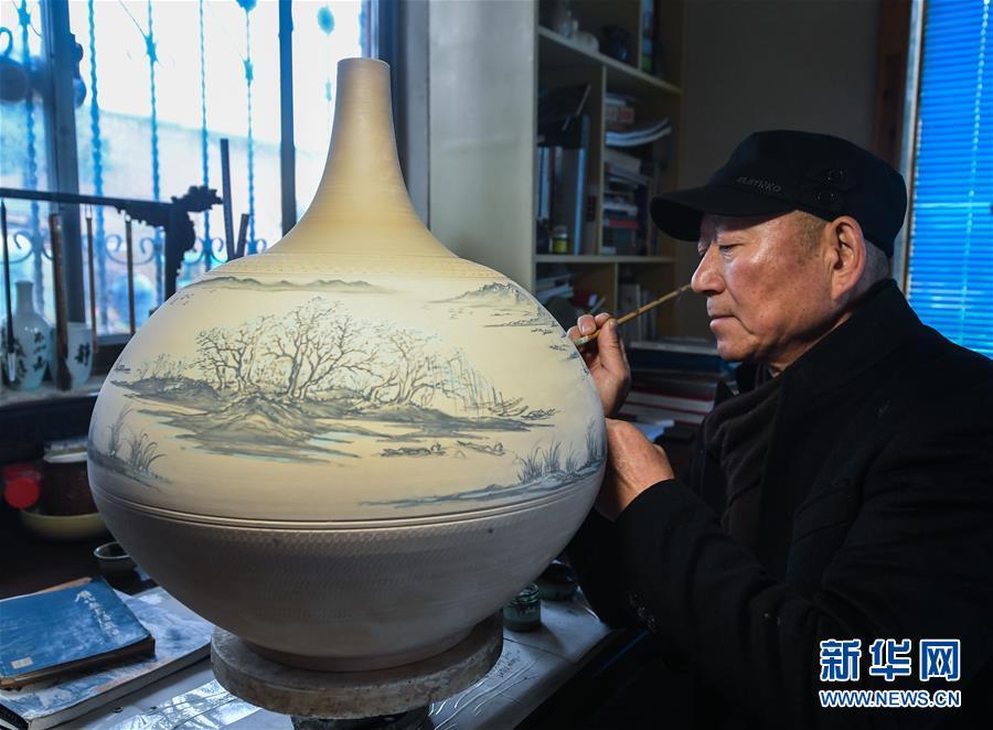 2月16日,陳新華在一個婺州窯大容瓶上進行釉下褐彩的創(chuàng)作。新華社記者 徐昱 攝