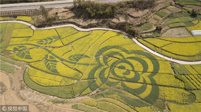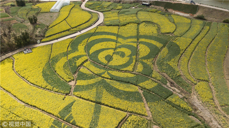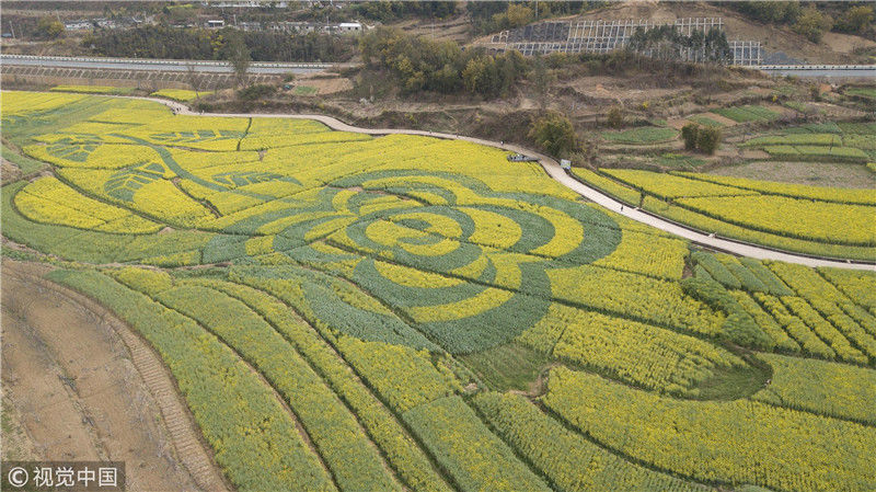 2019年近日,在云南省安寧市山口村,油菜花田里“長出”一朵巨大的“山茶花”,吸引游客到此觀賞拍照。圖為3月1日,航拍油菜花田中的山茶花圖案。劉冉陽(云南分社)/中新社/視覺中國
