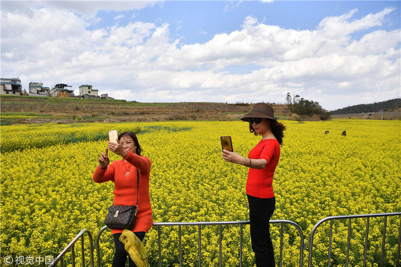 2019年3月1日,游客用手機拍照。近日,位于云南省安寧市的大片油菜花進入盛花期,吸引民眾到此賞花。