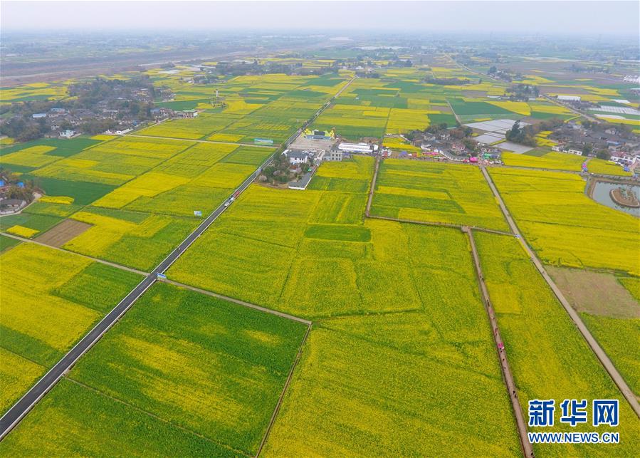 初春時節(jié),四川廣漢市西高鎮(zhèn)的油菜花盛開。金黃的油菜花與民居、道路等形成一幅幅鄉(xiāng)村畫卷,吸引游人踏青賞景。