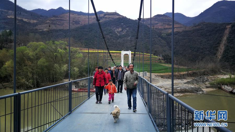 3月25日,略陽(yáng)縣徐家坪鎮(zhèn)藥木院村村民走在新修的鋼結(jié)構(gòu)吊橋上。 新華社記者陶明攝