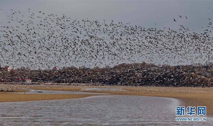 4月4日,一群候鳥在秦皇島市沿海濕地飛翔。近日,大批候鳥飛抵河北省秦皇島市沿海濕地,出現(xiàn)“萬鳥臨海”奇觀。秦皇島沿海濕地鳥類食物豐富,每年春、秋兩季,大批候鳥遷徙經過這里。新華社記者 楊世堯 攝