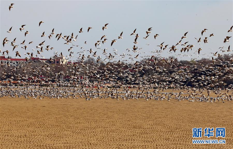 4月4日,一群候鳥在秦皇島市沿海濕地飛翔、休憩。近日,大批候鳥飛抵河北省秦皇島市沿海濕地,出現(xiàn)“萬鳥臨?!逼嬗^。秦皇島沿海濕地鳥類食物豐富,每年春、秋兩季,大批候鳥遷徙經(jīng)過這里。新華社記者 楊世堯 攝