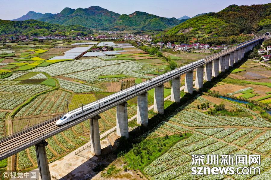 2019年4月8日,一列高鐵列車從京福高鐵安徽銅陵段一片盛開的鳳丹花海中駛過。隨著氣溫回升,安徽省銅陵市境內(nèi)的鳳丹競相綻放,高鐵列車穿行其間,成為春日里一道美麗的風(fēng)景線。