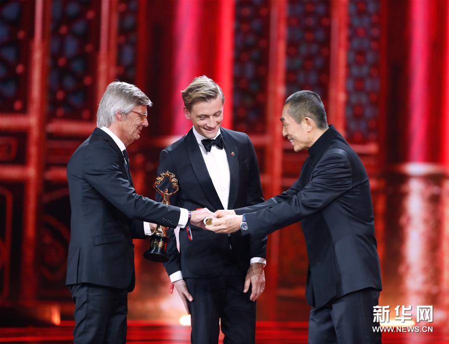 4月20日,影片《幸運兒彼爾》獲得“天壇獎最佳影片獎”,張藝謀(右)為領獎者(左)頒獎。 當日,第九屆北京國際電影節(jié)閉幕式暨頒獎典禮在北京懷柔國家中影數(shù)字制作基地舉行。 新華社記者 沈伯韓 攝