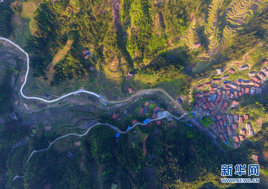 這是春耕時(shí)節(jié)的黔桂烏英苗寨梯田(4月16日無人機(jī)拍攝)。 新華社記者 黃孝邦 攝