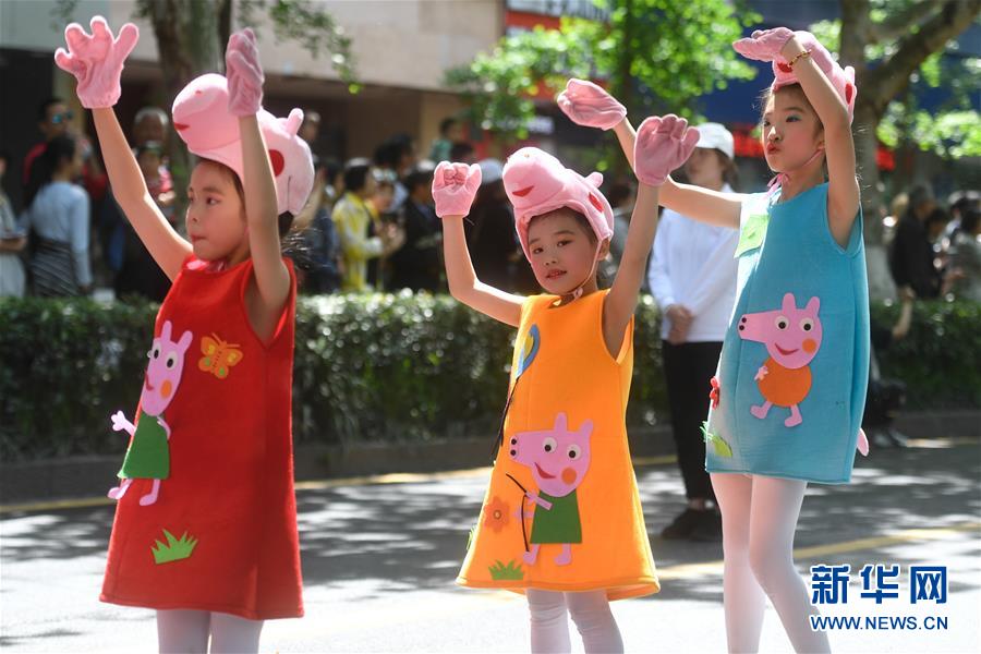 5月4日,扮演成“小豬佩奇”的演員在巡游隊伍中表演。當(dāng)日,第十五屆中國國際動漫節(jié)彩車巡游活動在浙江杭州南宋御街中北創(chuàng)意街區(qū)舉行。巡游表演隊伍約500米長,由4輛大型動漫彩車、1輛小火車及400多名演員組成。新華社記者 黃宗治 攝