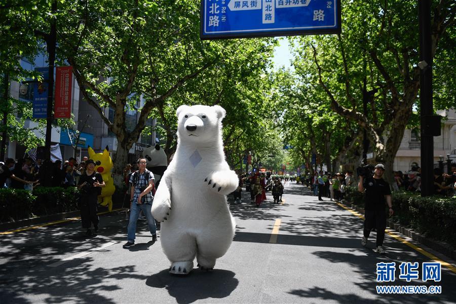 5月4日,演員裝扮成“北極熊”在巡游隊伍中表演。當(dāng)日,第十五屆中國國際動漫節(jié)彩車巡游活動在浙江杭州南宋御街中北創(chuàng)意街區(qū)舉行。巡游表演隊伍約500米長,由4輛大型動漫彩車、1輛小火車及400多名演員組成。新華社記者 黃宗治 攝