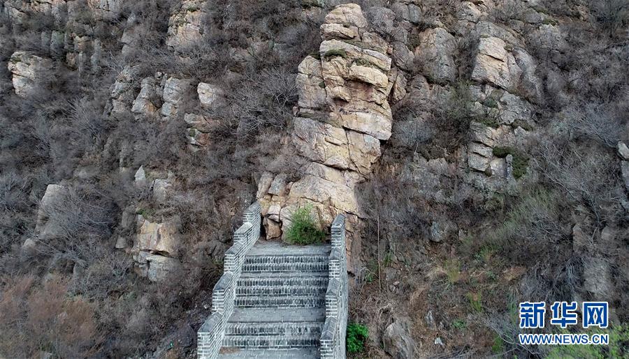 黃崖關(guān)長城東側(cè)的起點(diǎn)與陡峭的山崖相連(4月18日攝)。新華社記者 岳月偉 攝