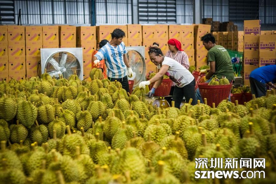 2018年4月20日晚上11點,泰國尖竹汶府的金枕頭榴蓮分裝廠區(qū)內(nèi)燈火通明,工人們正在對剛摘下來的20多噸榴蓮打包、稱重。