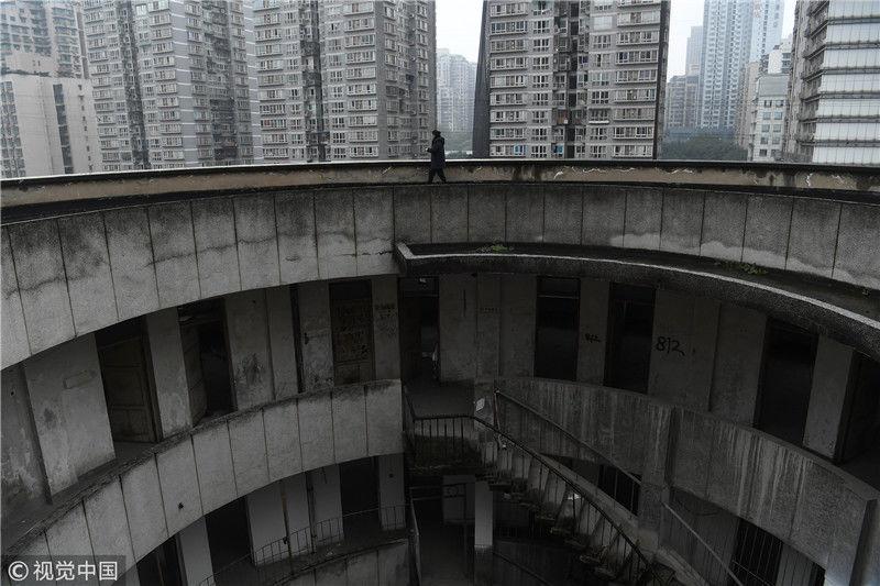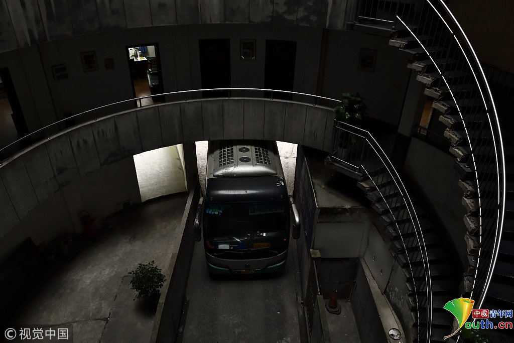 2018年12月6日,重慶江北紅旗河溝汽車站內(nèi),有一棟獨(dú)特的八層圓環(huán)狀建筑,底層每天有不少進(jìn)出站的客車通行。據(jù)悉,這棟樓建于1990年,曾經(jīng)是車站旅館,如今一、二兩層用于車站辦公,其余樓層已廢棄。為確保安全,三層以上已經(jīng)被封鎖。圖為公交車穿過(guò)8層空心圓筒樓。徐勇/視覺(jué)中國(guó)