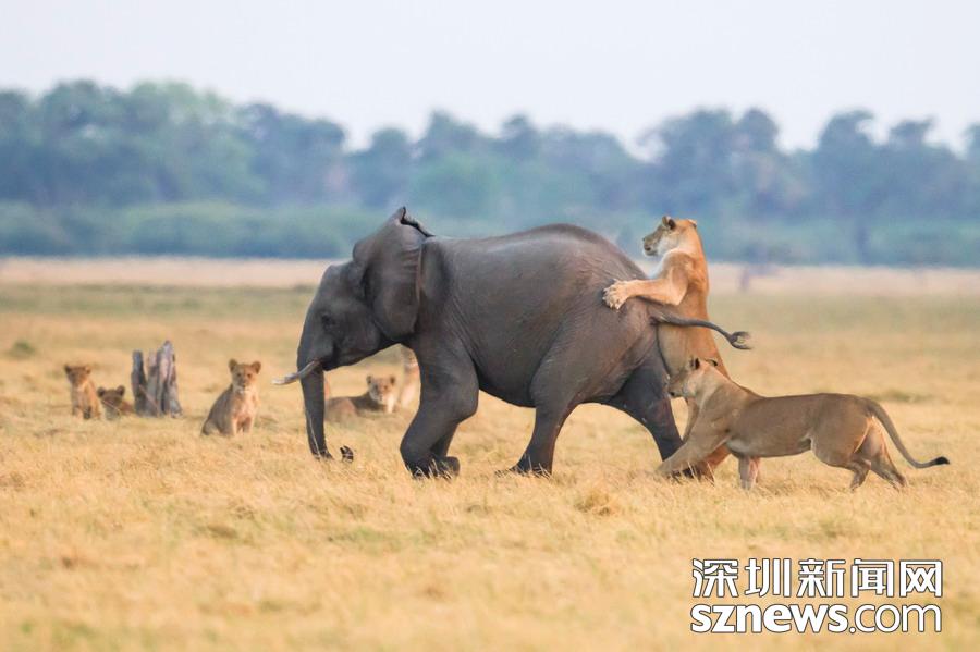 英國攝影師詹姆斯(James Gifford)在博茨瓦納喬貝國家公園拍到一群獅子獵食大象的精彩畫面。在詹姆斯的鏡頭下,一頭母獅跳到了一頭小象的背上想要將其拿下,但僅憑一己之力又不能做到。但當(dāng)母獅的后援抵達(dá)時,象群也趕到了現(xiàn)場。最終,小象回到了象群中獲得庇護(hù),而獅群也不得不悻悻離去。