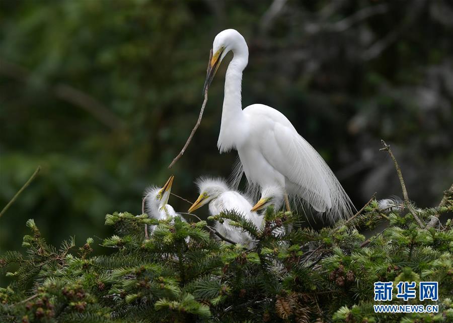 在江西省南昌市新建區(qū)象山森林公園內(nèi),白鷺和自己的雛鳥在一起(5月21日攝)。 近日,在江西省南昌市新建區(qū)象山森林公園內(nèi),已安家筑巢的大批鷺鳥陸續(xù)孵化出了后代。象山森林公園有著“鷺鳥王國”的美譽(yù),生態(tài)環(huán)境良好,每年都會吸引白鷺、蒼鷺、夜鷺等鷺鳥飛抵棲息和繁衍后代。 新華社記者 彭昭之 攝