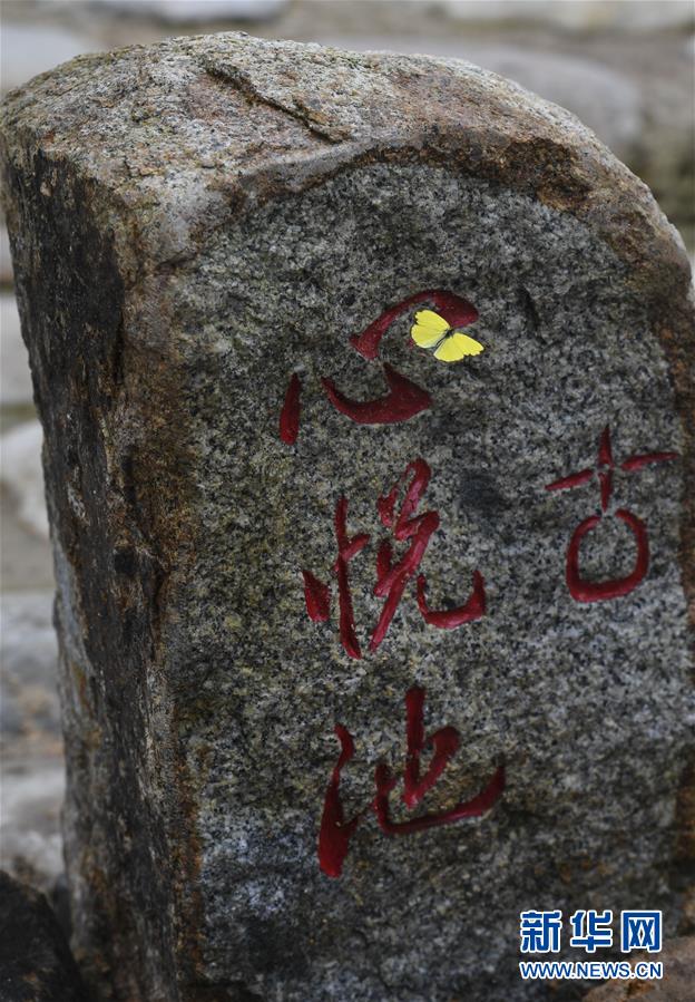 6月1日,一只蝴蝶落在香山古驛道的石碑上。
