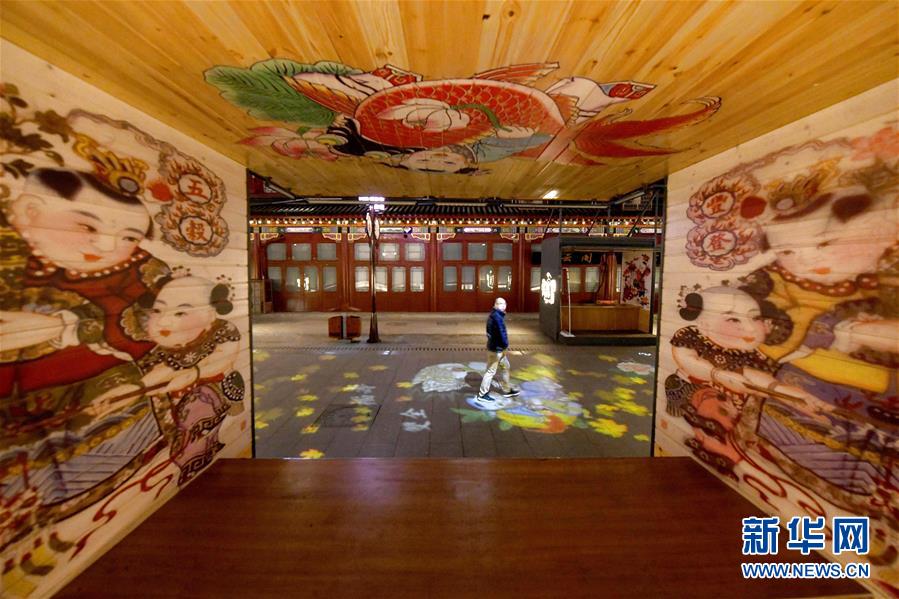 12月4日,游客在楊柳青古鎮(zhèn)步行街上欣賞年畫主題燈光。 近日,天津市西青區(qū)楊柳青古鎮(zhèn)在步行街新增9組以楊柳青年畫代表作為主題的動(dòng)態(tài)夜景燈光,講述古鎮(zhèn)與年畫的歷史。 新華社記者 岳月偉 攝