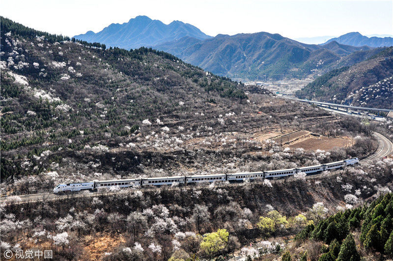 2019年3月22日,北京居庸關(guān)附近的山花盛開,S2線列車穿行在花海之中,構(gòu)成一幅美麗的畫面。時永平/千龍圖像/視覺中國 編輯/陳進(jìn)