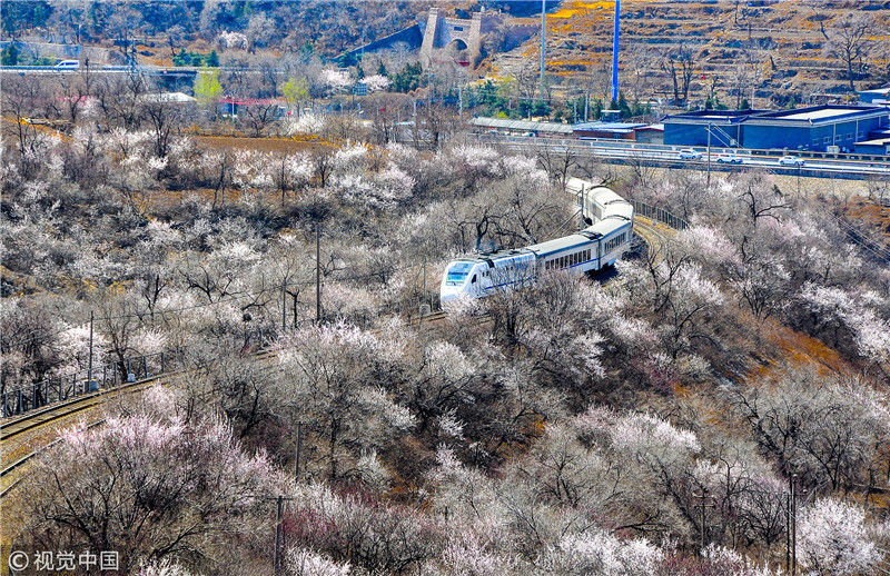 2019年3月22日,北京居庸關附近的山花盛開,S2線列車穿行在花海之中,構成一幅美麗的畫面。