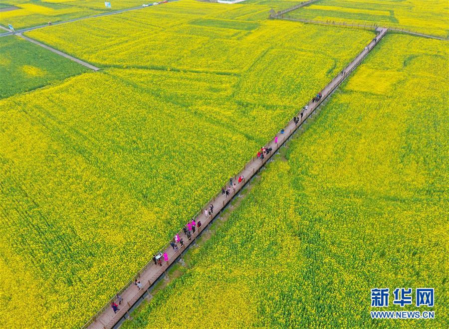這是無(wú)人機(jī)航拍的廣漢市油菜花田(3月6日攝)。 新華社記者劉坤攝