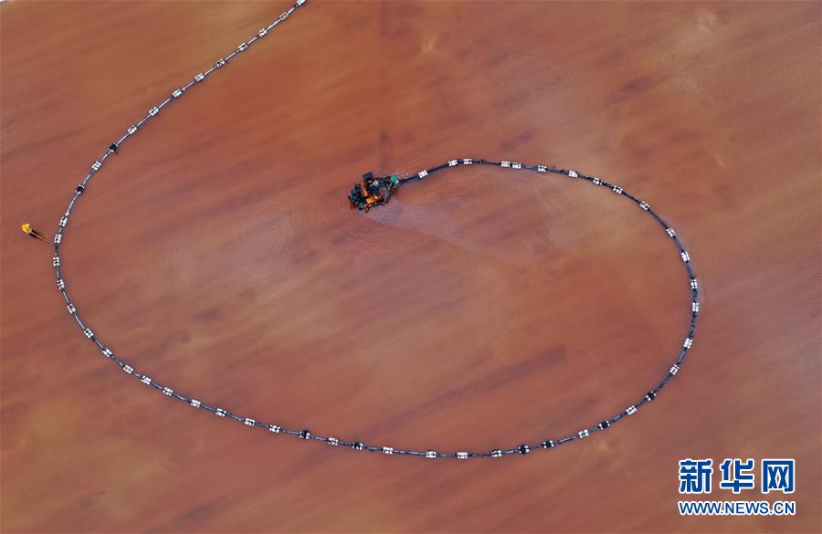 7月3日,唐山海港經(jīng)濟(jì)開發(fā)區(qū)大清河鹽場(chǎng)的工人在操作機(jī)械設(shè)備收獲春鹽(無(wú)人機(jī)拍攝)。