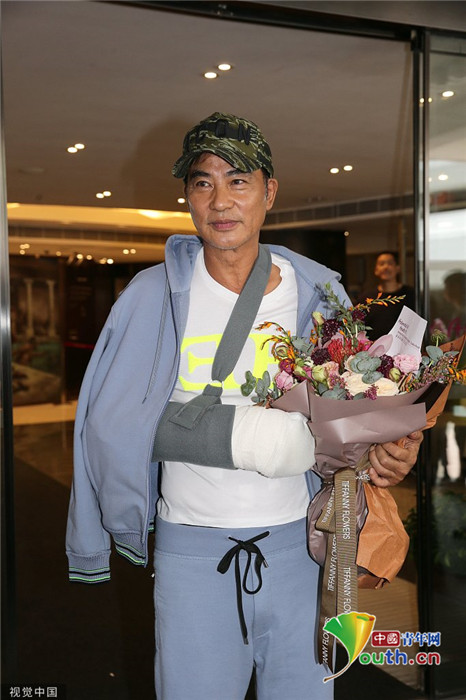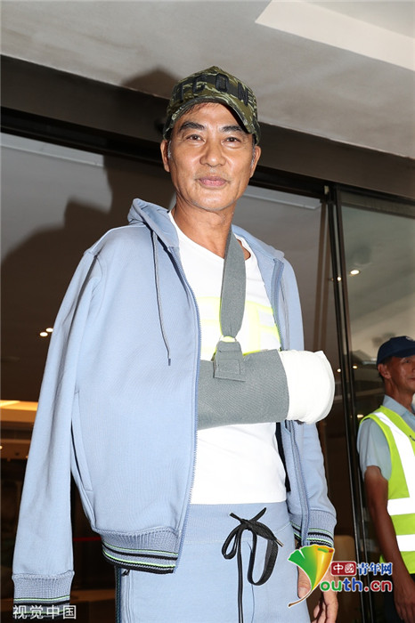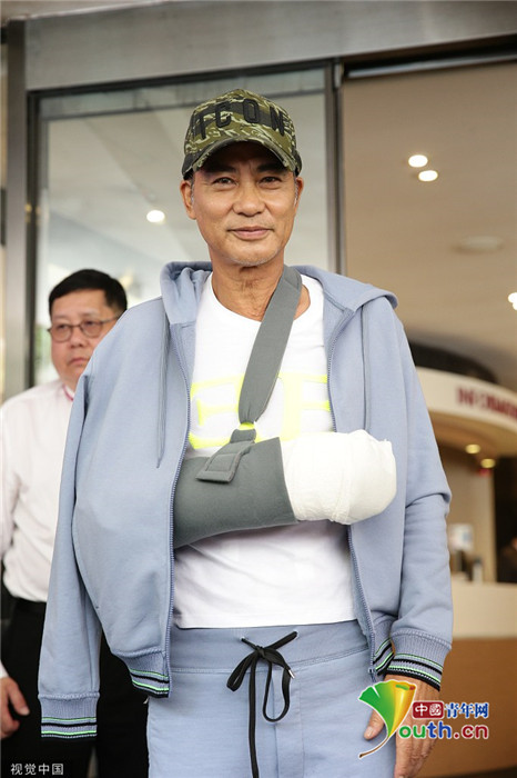 2019年7月24日,香港,任達華出院。他身穿藍色運動外套走出醫(yī)院,頭戴鴨舌帽,受傷的右手則套上白色護臂帶,面帶笑容,精神狀態(tài)非常好。
