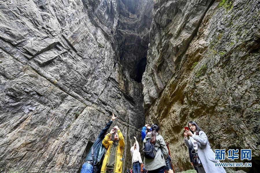 游客在天生三橋景區(qū)內(nèi)的黑龍橋景點游覽(3月27日攝)。 新華社記者劉潺攝