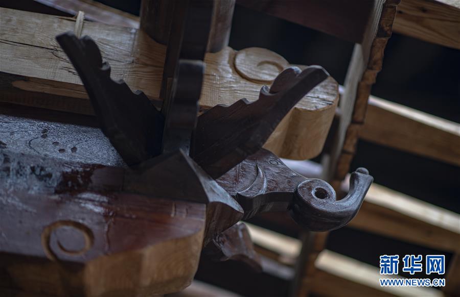 位于石屏縣異龍鎮(zhèn)符家營(yíng)村一戶老屋中“修舊如舊”的房梁(8月8日攝)。新華社記者 江文耀 攝